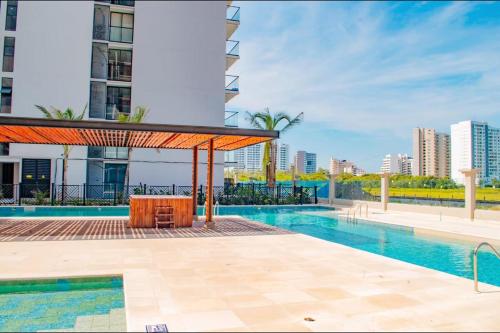 The preferred airport for Hotel Nueva Granada is Santa Marta (SMR-Simon Bolivar) - 18.7 km / 11.6 mi