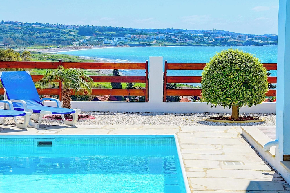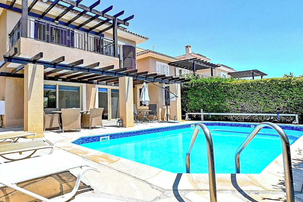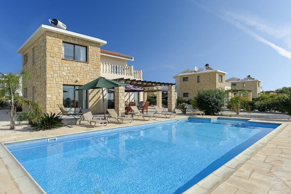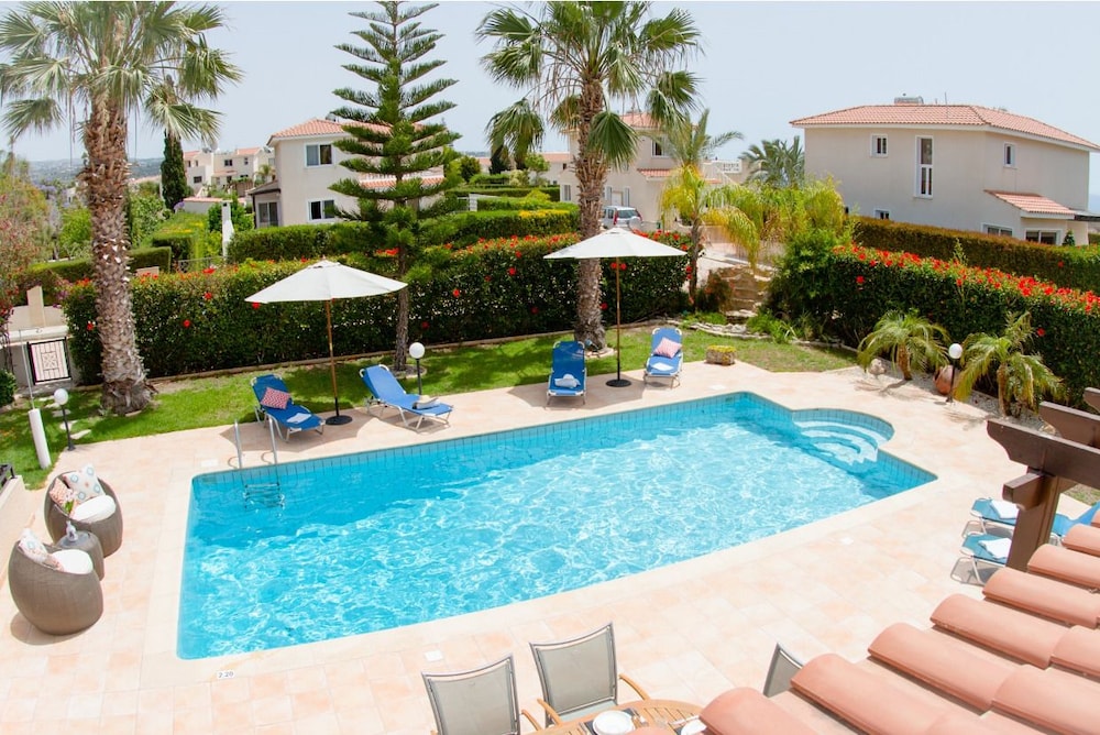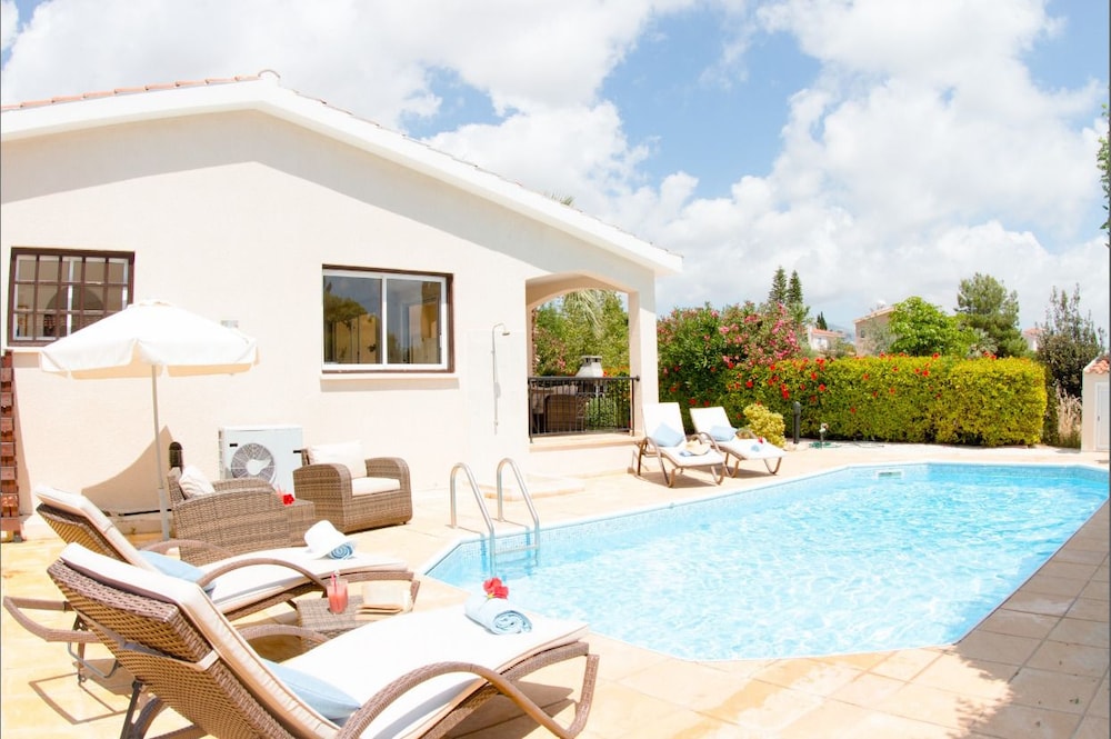 This attractive light and airy lemon-yellow villa is located in a quiet residential area just a five-minute walk from the centre with its wide variety of shops, bars and restaurants. There are also a selection of sandy beaches with plenty of watersports just a ten-minute stroll away. There is also plenty to see and do in nearby Paphos itself, the whole town has just been listed as a UNESCO World Heritage Site The villa has been tastefully decorated in vanilla tones with plenty of homely Cypriot details and attractive tiled floors. There are three good sized bedrooms, all en-suite, as well as a fully-fitted kitchen-cum dining room and a comfortable lounge opening out onto a veranda. Guests will enjoy al fresco dining and making use of the barbecue. The large private pool comes complete with sun-loungers and a sun terrace. Other amenities include satellite TV and free Wi-Fi.
