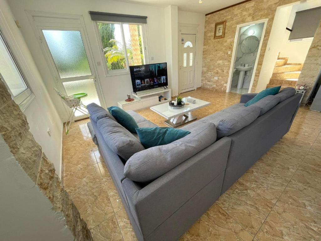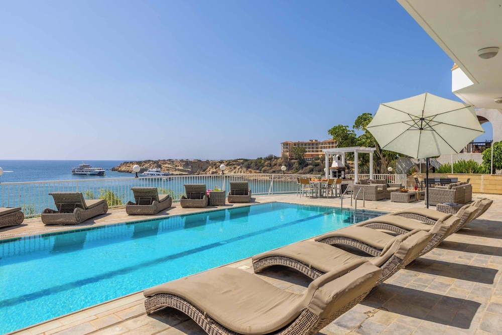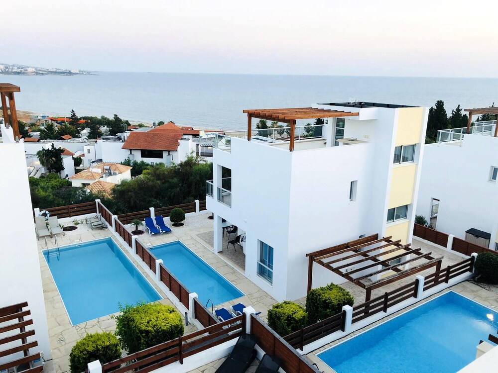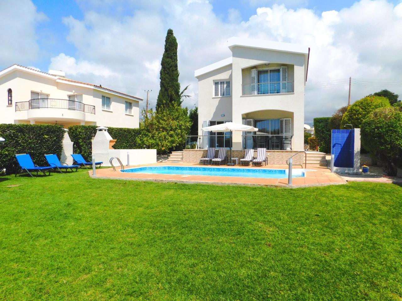 This attractive light and airy lemon-yellow villa is located in a quiet residential area just a five-minute walk from the centre with its wide variety of shops, bars and restaurants. There are also a selection of sandy beaches with plenty of watersports just a ten-minute stroll away. There is also plenty to see and do in nearby Paphos itself, the whole town has just been listed as a UNESCO World Heritage Site The villa has been tastefully decorated in vanilla tones with plenty of homely Cypriot details and attractive tiled floors. There are three good sized bedrooms, all en-suite, as well as a fully-fitted kitchen-cum dining room and a comfortable lounge opening out onto a veranda. Guests will enjoy al fresco dining and making use of the barbecue. The large private pool comes complete with sun-loungers and a sun terrace. Other amenities include satellite TV and free Wi-Fi.