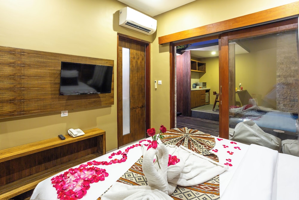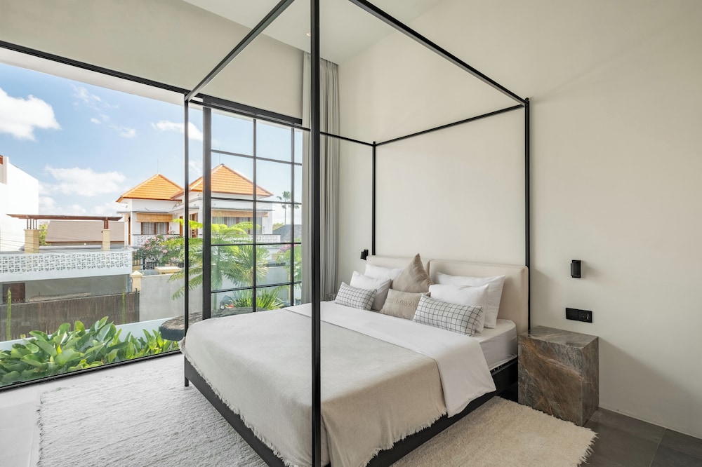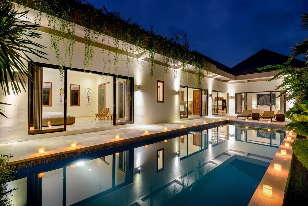 The property is located on Br. Bumbak, Umalas Kerobokan, around 10 minutes' drive from the best restaurants, shopping, entertainment, beaches and other attractions in Seminyak. The domestic and international airports are both roughly 30 minutes by car from this property.Situated in a quiet, traditional village, the hotel is surrounded by lush tropical gardens and enjoys views of the rice terraces. Designed to provide complete privacy and full service, the property consists of two adjacent private villas with 8 bedrooms in total, and the property is set on 2,000 square metres of land. Guests are welcomed in the lobby, which offers a 24-hour reception and a 24-hour check-out service, and a hotel safe. Younger guests can let off steam on the children's playground, and there is also a TV lounge. Wireless Internet access, a laundry service and a bicycle hire service are offered. Those arriving by car may leave their vehicles in the hotel car park or garage.The 4-bedroom villa enjoys westerly rice field views, the master bedroom with master en-suite bathroom is situated on the ground floor, which consists of a lounge area with satellite TV and stereo system, an open-plan dining area and a Western kitchen. The first floor contains three air-conditioned bedrooms with en suite bathrooms with shower, bathtub and hairdryer. The bedrooms feature a double bed and two twin beds overlooking a rice field. The first entrance villa features two ground floor bedrooms with bathrooms, a TV room and an inter-connected living and kitchen area. The first floor contains the other two air conditioned bedrooms with en suite bathrooms. The kitchens are equipped with a minibar, fridge, cooker, microwave and tea and coffee making facilities. The villas also come equipped with a direct dial telephone, satellite TV, Internet access, a hifi, safe, ironing set, individually regulated air conditioning and a balcony/terrace as standard.