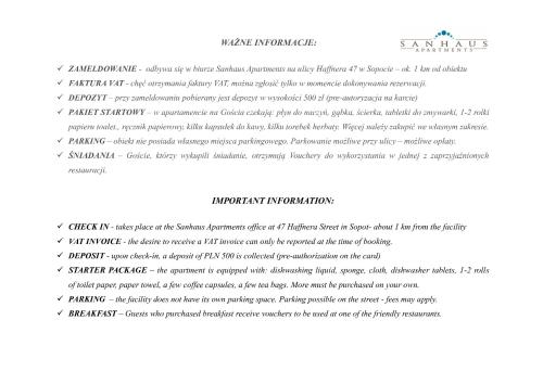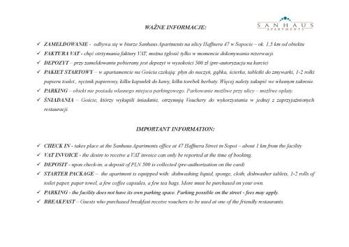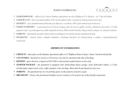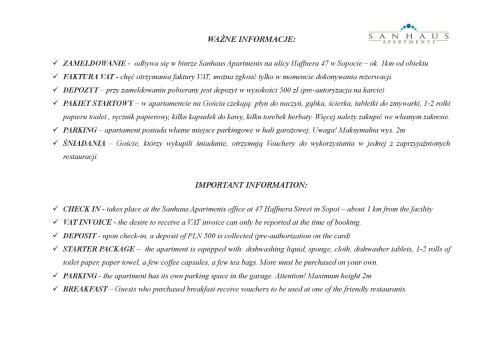 There is no front desk at this property. The check-in location differs from the property location. Check-in location: [3 Maja 44A Street, Sopot]. To make arrangements for check-in please contact the property at least 72 hours before arrival using the information on the booking confirmation. If you are planning to arrive after 8:00 PM please contact the property in advance using the information on the booking confirmation. Guests must contact the property in advance for check-in instructions. The host will greet guests on arrival.
