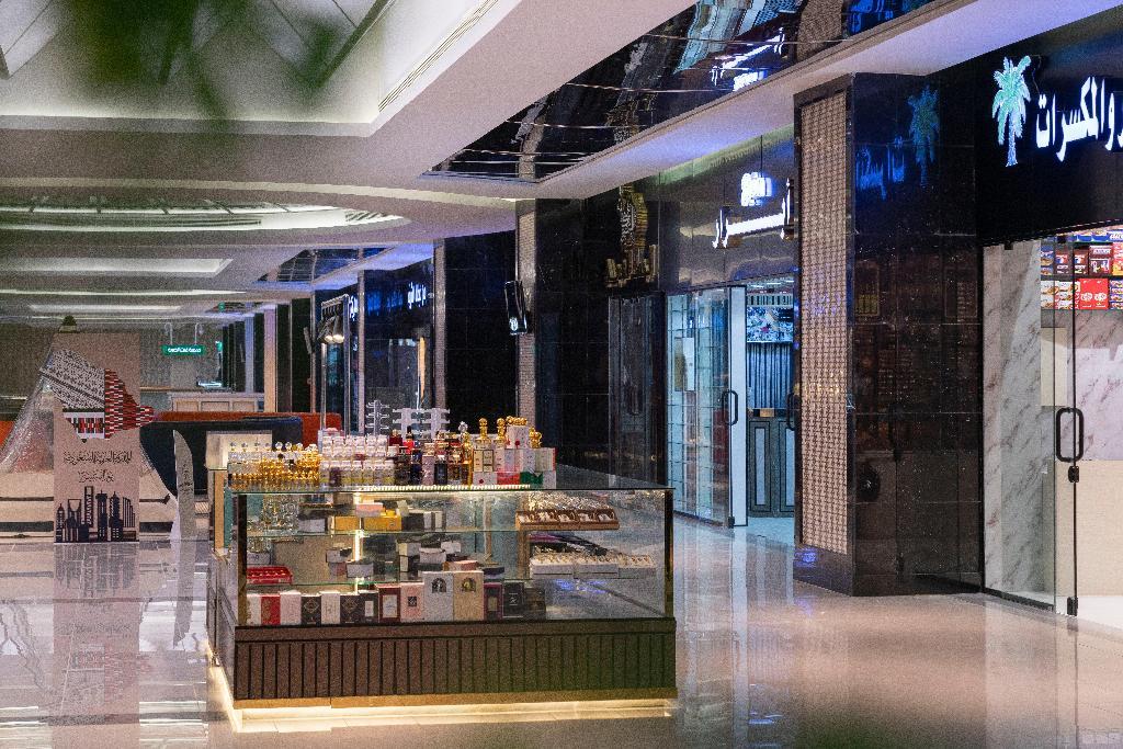 Tall modern building surrounded with lots of shops, not far way from the holly mosque.