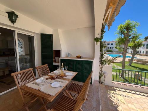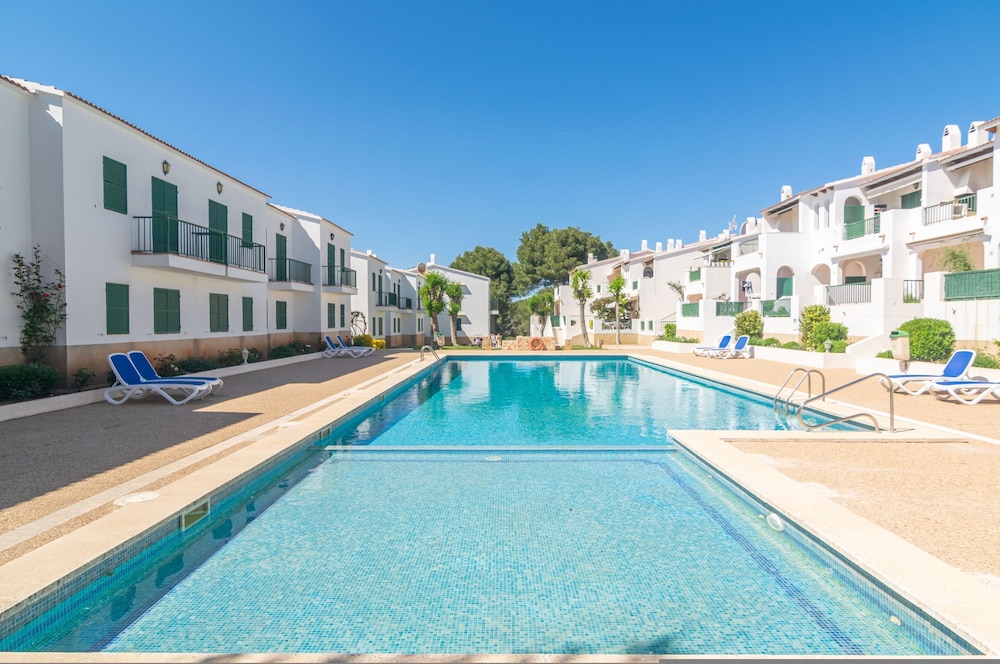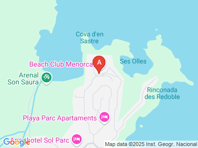 This resort has 196 rooms spread over 2 buildings of 2 floors. The main building has a lobby with24-hour reception. The complex also includes a buffet restaurant,a la carte restaurant, a café, a bar with terrace sea view, a mini market, games room, TV room, free internet access in the hall and bar Blau. It also has a childrens playground. There is an outdoor pool with separate children's area, snack bar and sun terrace with lounger sand parasols. Sports enthusiasts also have the tennis court, basketball, the opportunity to play table tennis, and enjoy various water sports in the beach. Beyond this, about 1 km away, is the only golf course on the island of Menorca. The cozy rooms are equipped with living room, bathroom, satellite TV, telephone, kitchenette, separate bedroom with2 single beds, safe (to rent) and balcony or terrace.