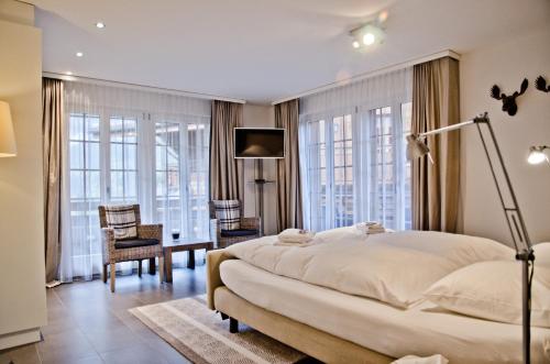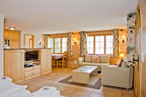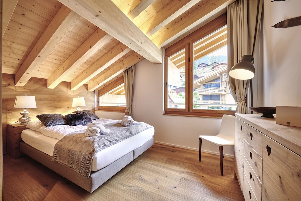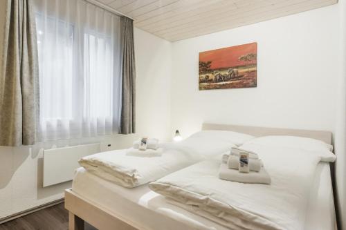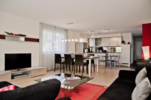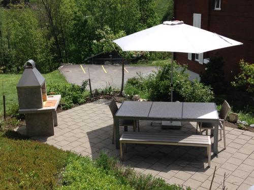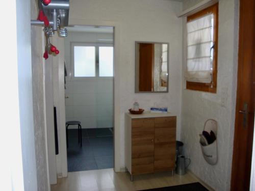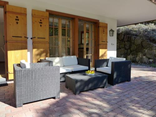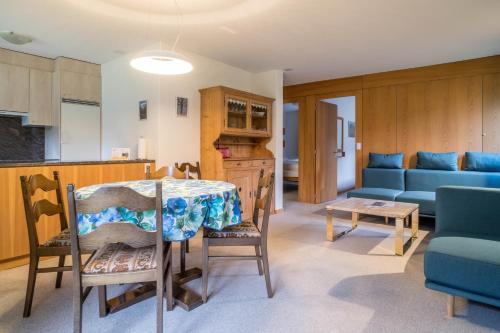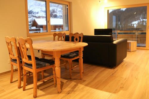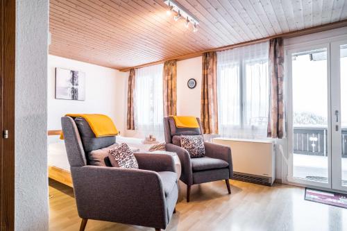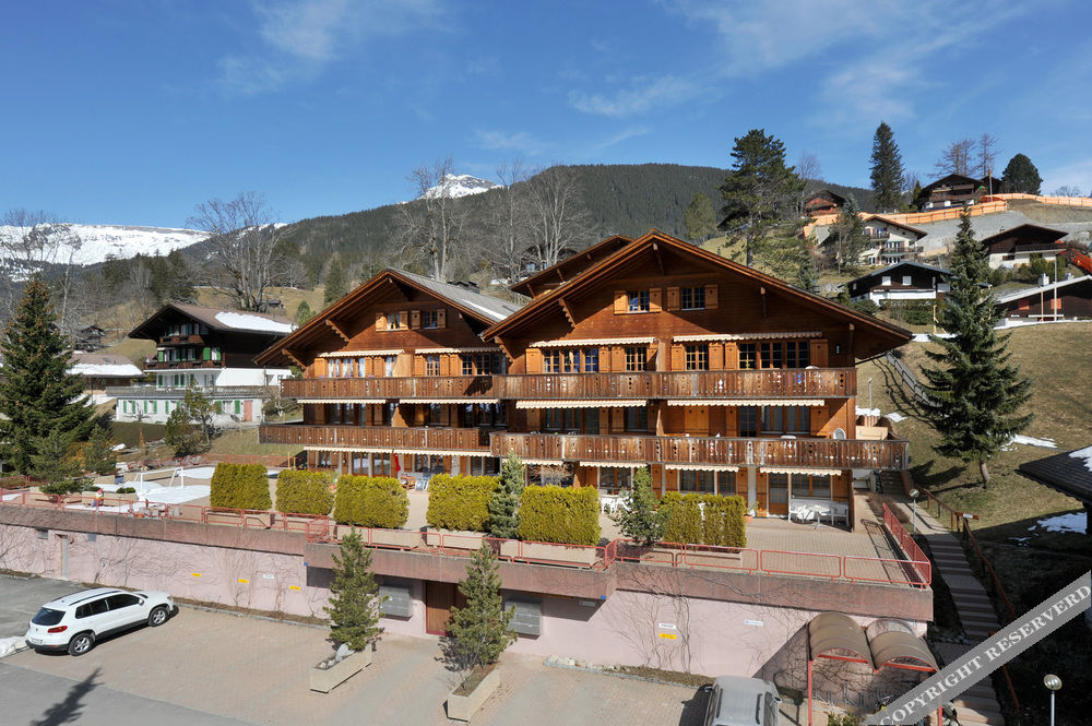 3-room apartment 73 m2, on the upper ground floor, south facing position. Bright, cosy furnishings: living/sleeping room with panoramic window with 1 double sofabed (2 x 90 cm, length 200 cm), international TV channels and flat screen. Exit to the balcony, to the loggia, to the patio, south facing position and west facing position. 2 rooms, each room with 2 beds (90 cm, length 200 cm). Kitchen (oven, dishwasher, 4 ceramic glass hob hotplates, microwave, electric coffee machine, raclette grill) with hatch, boiler (20 litres). Bathroom, sep. WC. Electric heating, boiler (300 litres). Parquet floors. Patio, south facing position and west facing position. Balcony furniture. Marvellous panoramic view of the mountains. Facilities: hair dryer. Internet (WiFi, free). Garage, height 210 cm, width 220 cm. Please note: non-smokers only. Fire extinguisher.