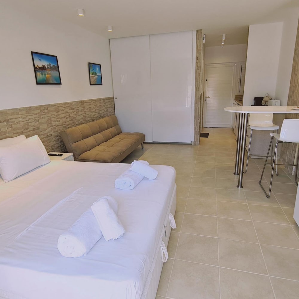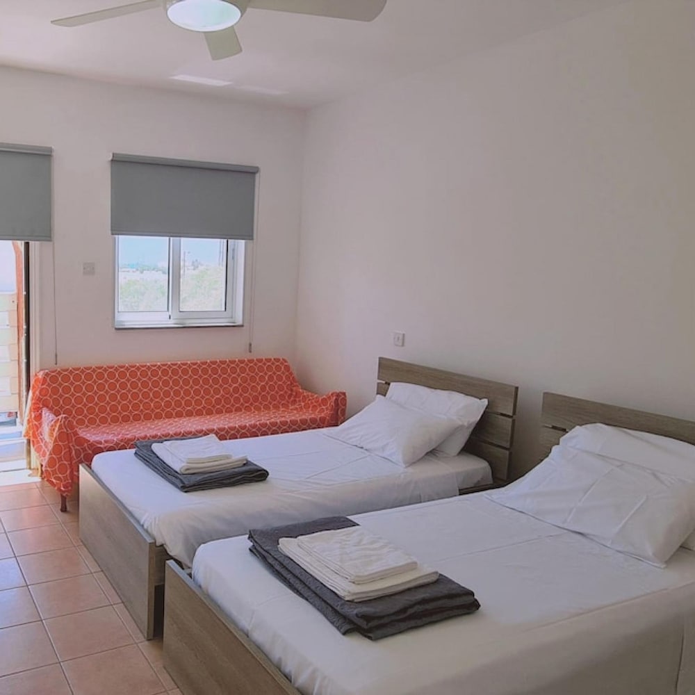 Location: The hotel is some 300 m from the beach and only about 1.5 km away from the centre of Ayia Napa. It is within easy reach of all of the restaurants, bars, pubs and shops. The bus station is approximately 300 m away and various nightspots can be reached in about a 15-minute walk. The hotel is around 1 km away from the Napa Olympic clinic. Larnaca Airport is approximately 43 km away and Paphos International Airport is some 145 km from the establishment. Rooms: All accommodation units feature air conditioning, central heating, a kitchen and a bathroom. A balcony or terrace is also included as standard. The accommodation units each feature a double bed. A safe is also available. The kitchenette features a fridge. The rooms offer a range of amenities, including a cooker. A washing machine is also available to guests. Internet access, a telephone, a TV and wireless internet access are provided for guests' convenience. Wheelchair-accessible accommodation units are also bookable. Meals: The establishment offers breakfast as a bookable board option.