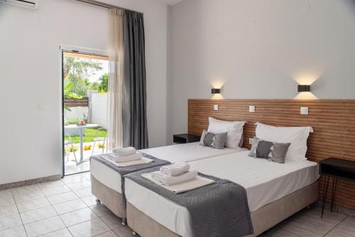 Our studios sleep 2 to 3 guests and our two-bedroom apartments sleep 4 to 5 guests. All studios and apartments are equipped with fully equipped open plan kitchenette, with fridge, small oven and 2 cooking rings. They have shower/WC, A/C, safety deposit boxes and balconies. Our complex features a swimming pool with sunbeds and umbrellas. The snack bar is located at the swimming pool area, offering full English breakfast, coffees, fresh juices and ice-creams, and also a variety of delicious snacks (burgers, pizza, club sandwich and many more) throughout the day. Spirits, shots and a variety of beers are also served. Our pool bar is the ideal place to relax with a refreshing cocktail. Satellite TV (SKY TV) is available at the pool area, offering all the top football games and popular TV shows. Greek nights and melon parties are regularly organised.