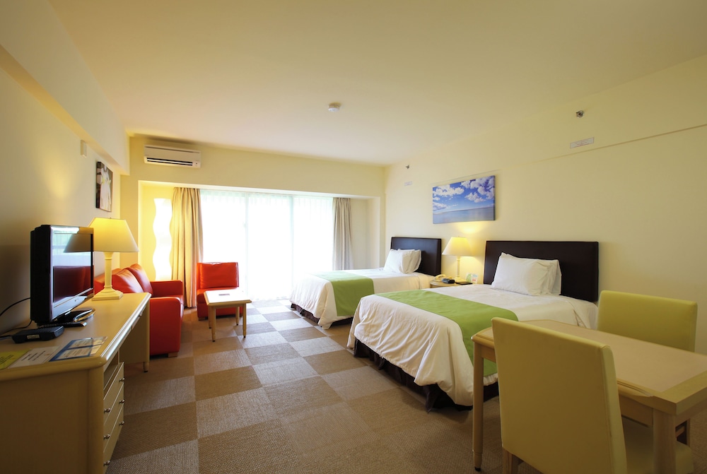This is a huge resort and the property occupies 1% of the entire island. It is consisted of two parts; a hotel complex and an apartment complex, and is located inland and takes approximately 30 minutes from Guam International Airport. 30 minutes travel by free shuttle bus takes you to the tourist centre of Tumun area with various restaurants and shops.The rooms are very large with a private balcony looking out onto the views of mountain . Both rooms and bathrooms are in exceptional condition.There are seven restaurants in the hotel complex including a poolside snack counter and you can also dine at the open air restaurant and poolside bar in the apartment complex, and a club house restaurant on the golf course, too.The hotel is a modern white block building with orange colored roof.There is no front reception on this building. Receiption center on the opposite side of this building attached to swimming pool is available for check-in/out and any assistance.** This hotel was previously known as Leopalace (Belevedere Annex) **On the property you can take advantage of four golf courses designed by Jack Nicklaus and Arnold Palmer, 3 football fields, two ball game fields, four flood-